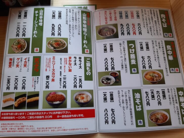 『そば処かほく 泉インター店』のメニューは、次の通りですね。肉そば、鳥中華の他に、つけ蕎麦、中華そば、油そば、山形辛味噌らーめんもありました。