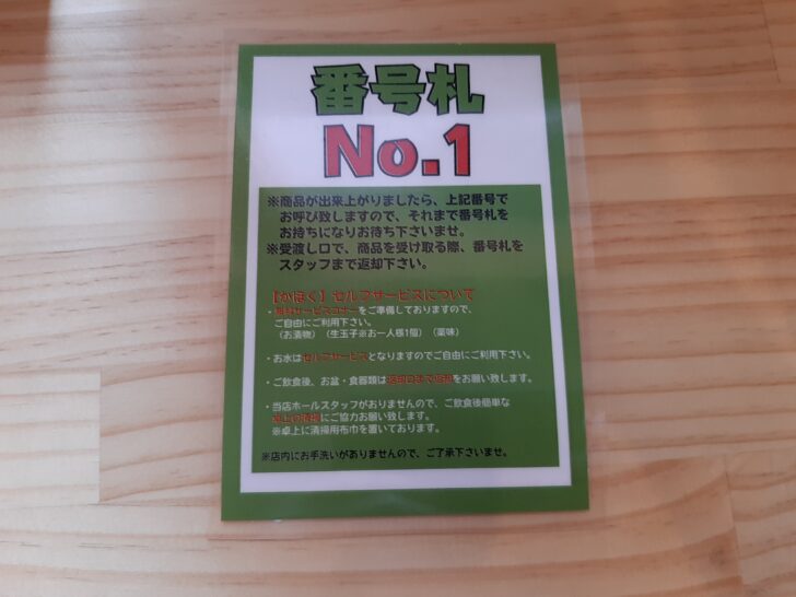 一番好きなのは「冷たい肉そば」ですが、かほく本店にて、何回も食べているので、今回は、「冷たい鳥中華」を注文しました。注文方法は、自動券売機で食券を購入して、お店の一番奥の「食券・商品受け渡し口」でお店の方に食券を渡します。この時に、「冷」か「温」かを聞かれます。そして、次のような番号札を受取ります。私は、早く行きすぎたのかポールポジションでした。なので、番号札はNO.1でした。