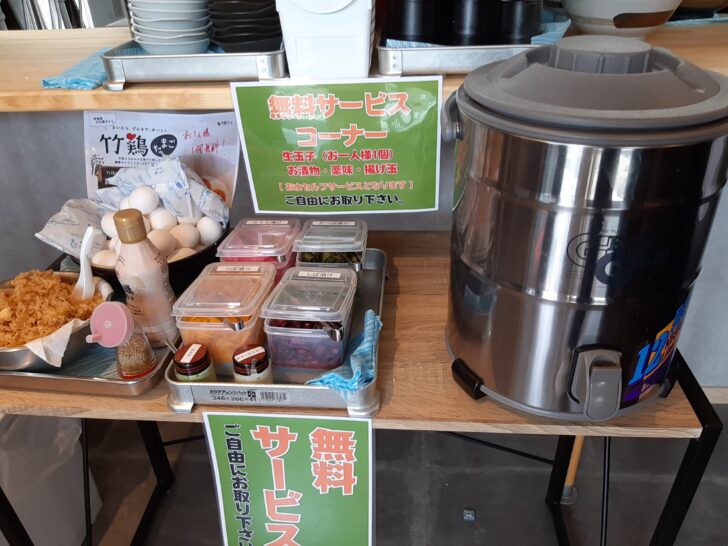 無料サービスは生玉子(竹鶏たまご)はお人様1個。揚げ玉、すりごま、わさび、にんにく、お漬物は4種類(さくら漬け、かっぱ漬け、つぼ漬け、しば漬け)は、取り放題のようです。