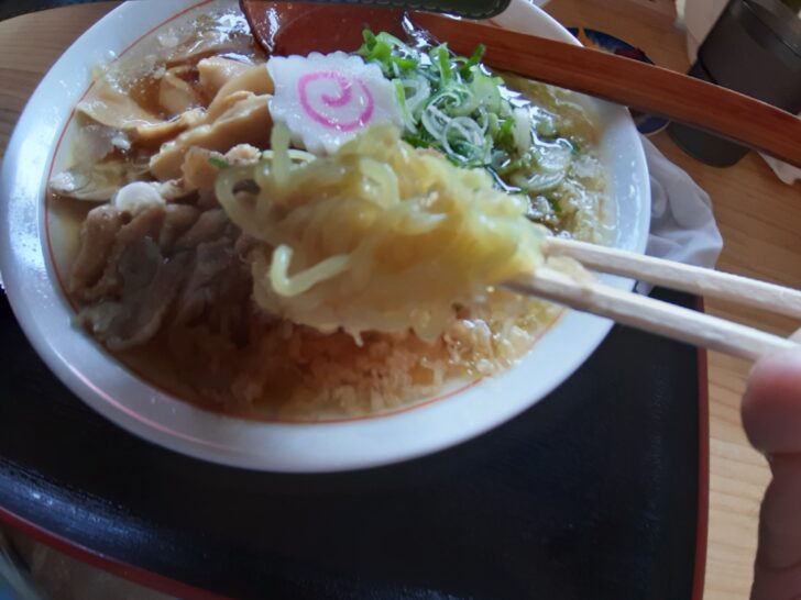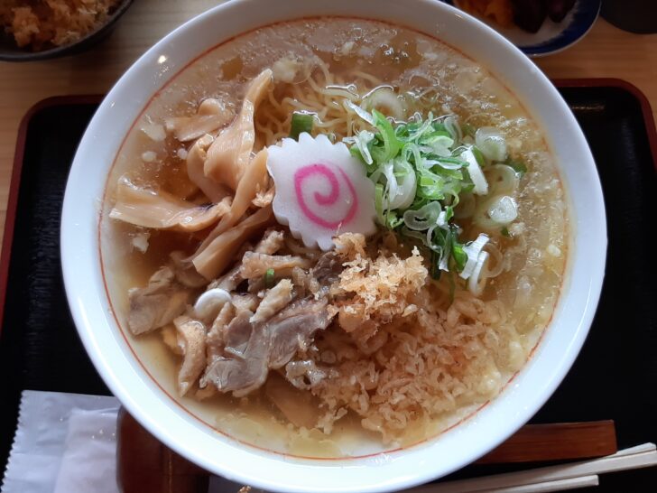 具材は、親鳥肉、メンマ、ナルト、ねぎ、揚げ玉ですね。