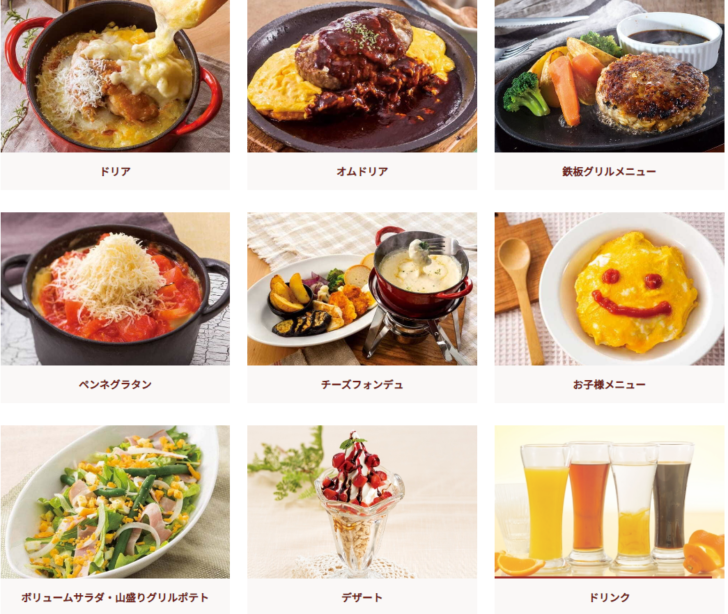 『横濱元町ドリア 仙台ヨドバシ店』ので提供される料理メニューは、他の店舗と同じでこんな感じになると思われます。
