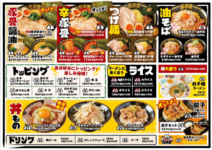 麺類のメニューは、「豚骨醤油」「辛豚骨醤油」「濃厚豚骨つけ麺」「油そば」「お子様ラーメン」の5種類です。それにトッピング各種ですね。他には肉系の丼物3種類(ローストポーク丼、ネギチャーシュー丼、ゴロチャー丼)、ライス4種類(小・中・大・鬼盛)、餃子などがあります。