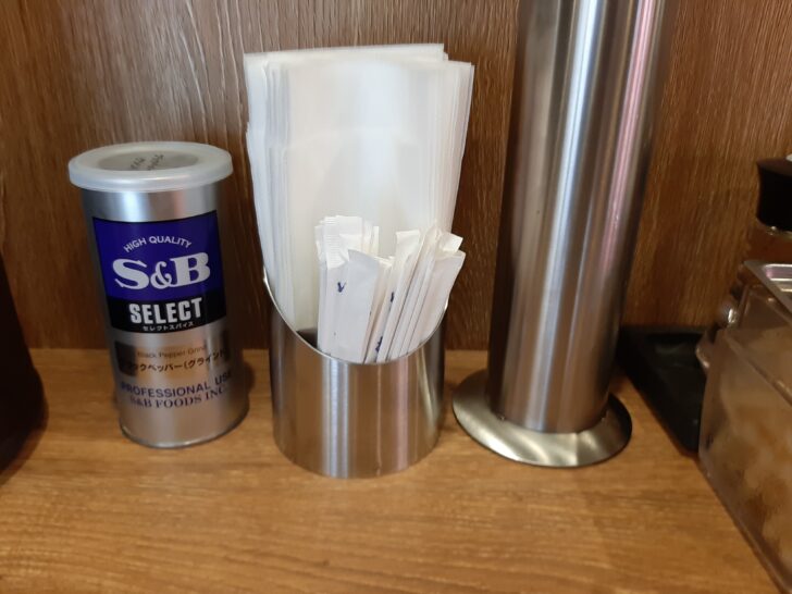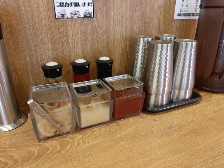 卓上調味料は、左手前より、刻みショウガ、おろしニンニク、豆板醤が置かれていて、奥側は左から餃子用の酢、辣油、醤油が置かれていました。