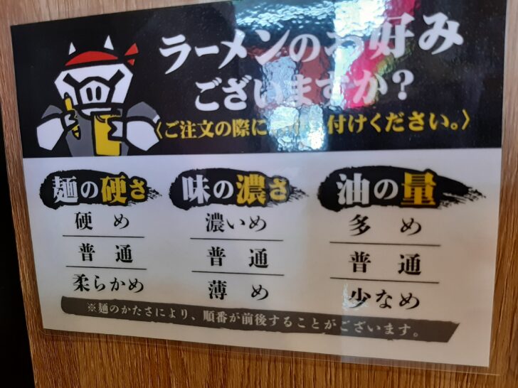 着席すると、店員の方が麺の硬さ、味の濃さ、油の量を確認します。