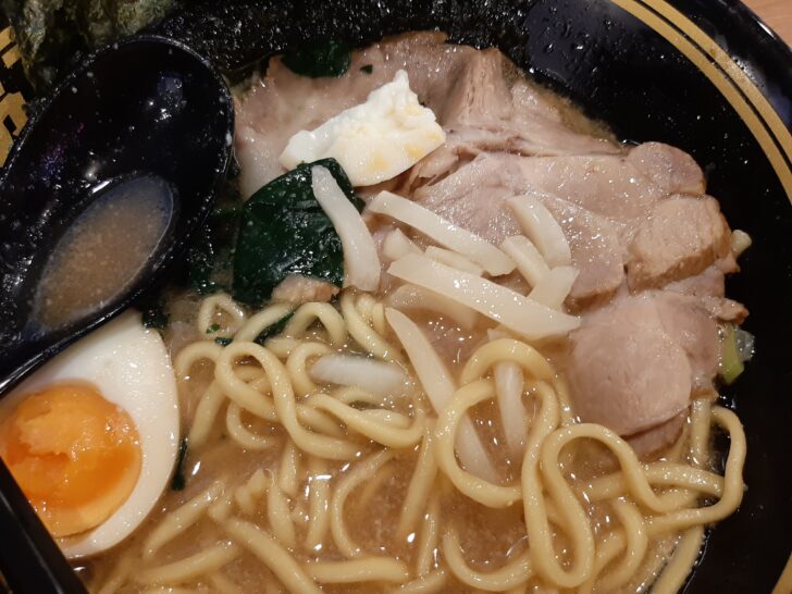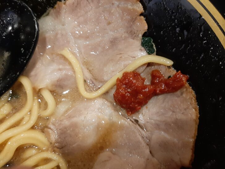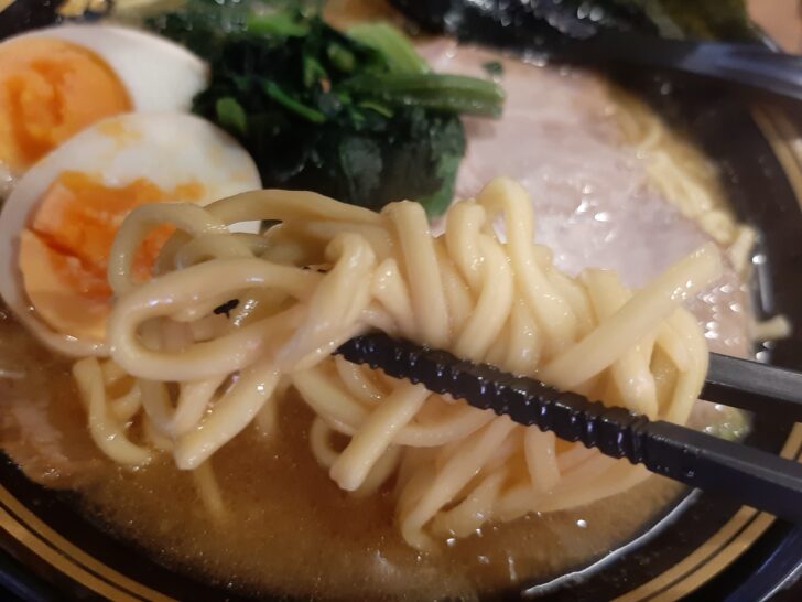 麺は横浜家系としては当たり前のストレート太麺ですね。モチモチした麺でコシがあって噛み応えがあって美味しいです。