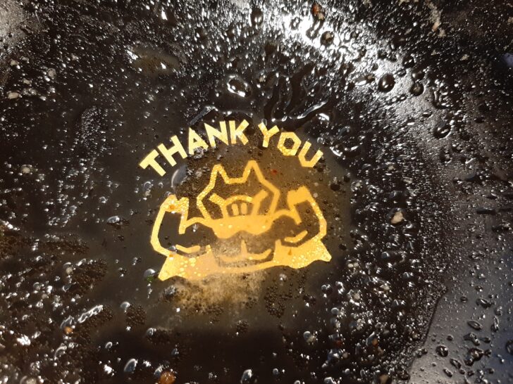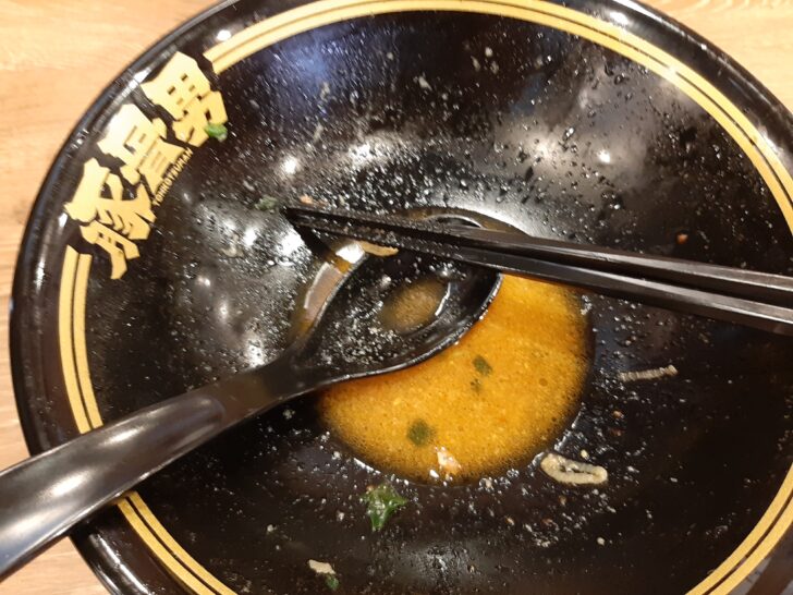 丼の底に何かが隠れているとの情報があったのを思いだしてので、スープも完飲してみました。そうしたら、豚骨男のロゴマークとTHANK YOUの文字でした。