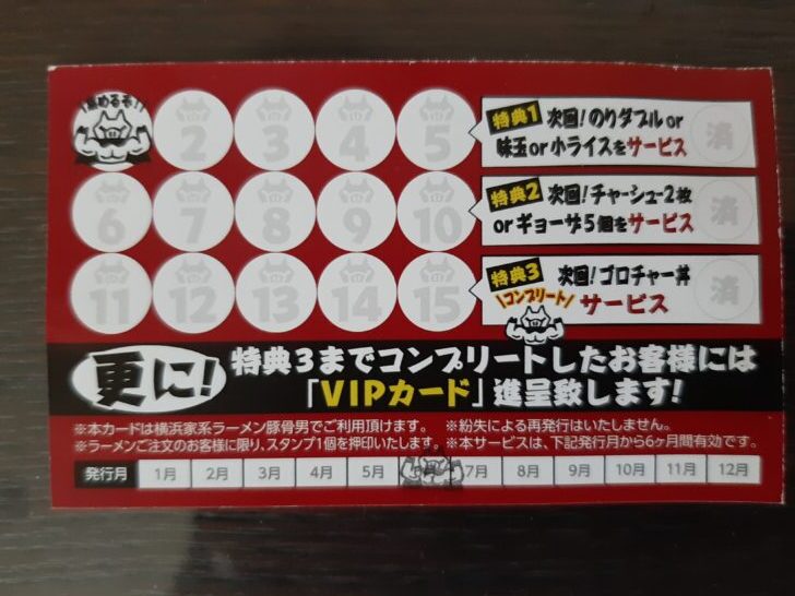 スタンプカードは5回行く毎に特典サービスがあるようです。15回行くと、「VIPカード」が貰えるようです。