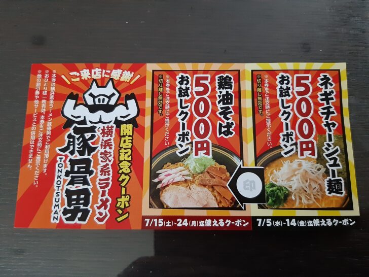 横浜家系らーめん『豚骨男(とんこつまん) 』は、2023年6月23日グランドオープンしました。早速食べに行ってみましたが、開店記念クーポンを貰えたので良かったです。