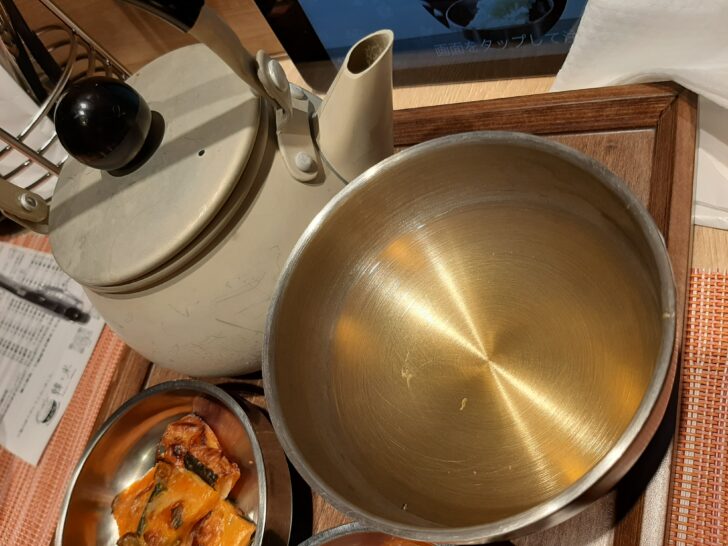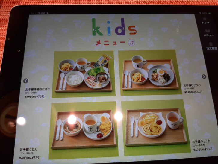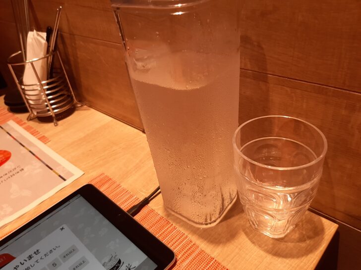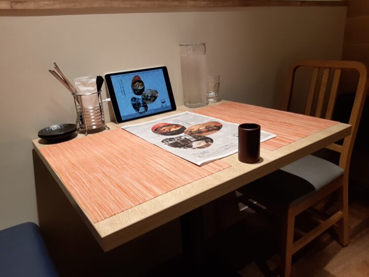 テーブルには料理を注文するタブレット、お冷、箸、御飯へら、紙おしぼりが置いてありました。