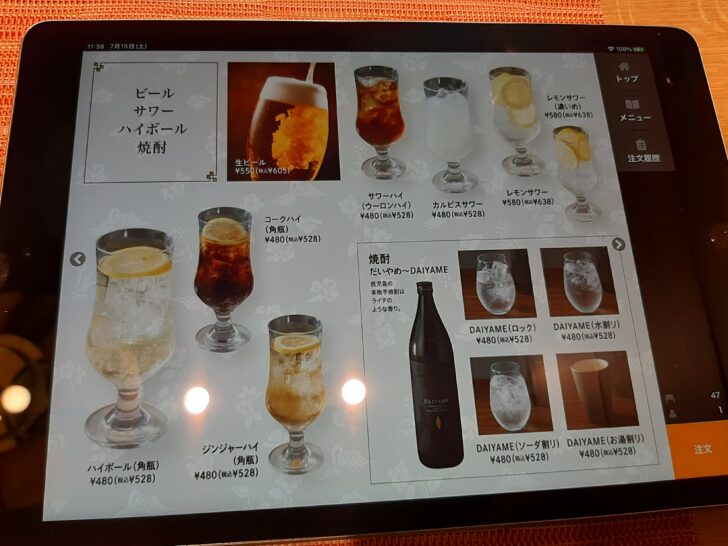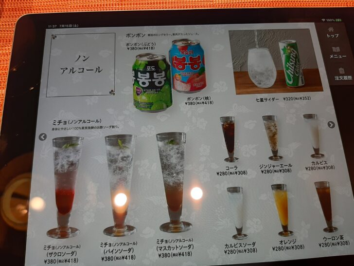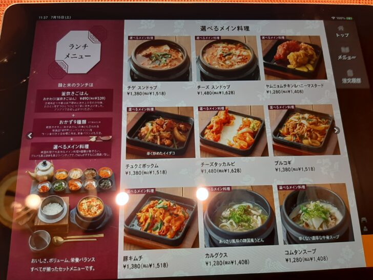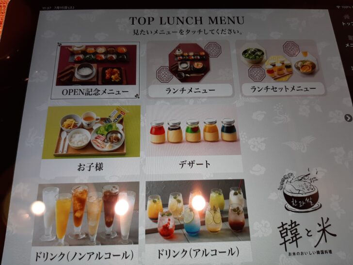 『韓と米(はんとこめ) 仙台ヨドバシ店』の料理メニューは、こちらです。タブレットのメニューは分かり易くなっていました。