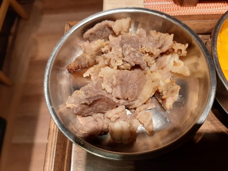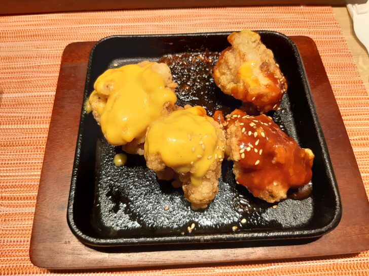 メイン料理はニャンニョムチキン&ハニーマスタードですね。唐揚げ4個が熱々の鉄板で提供されました。