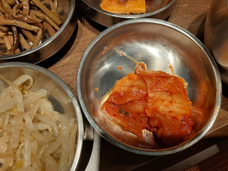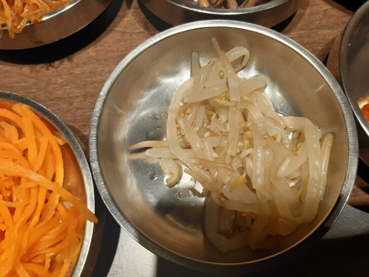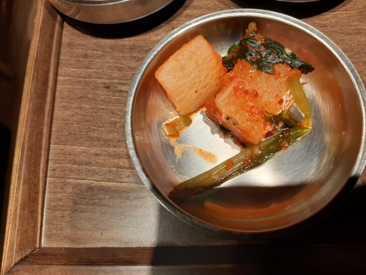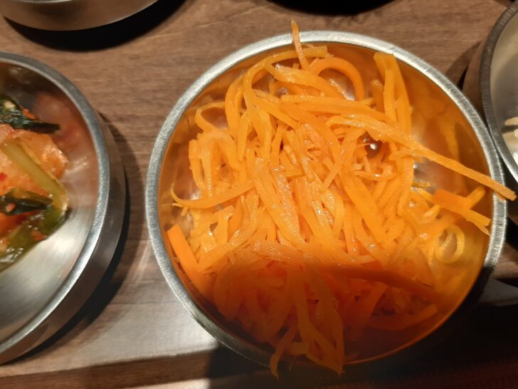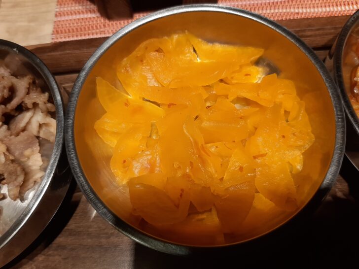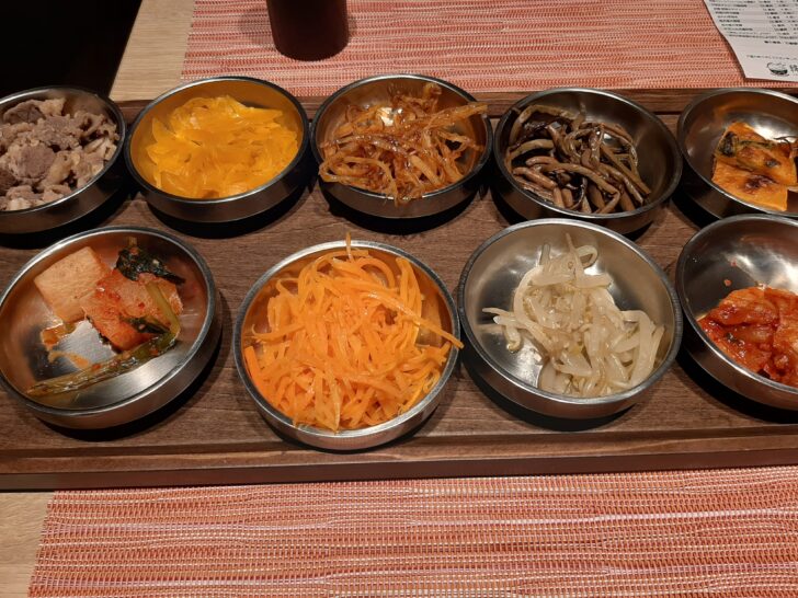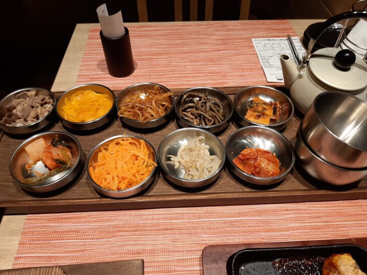 オープン記念で特別価格になっている「ヤンニョム&ハニーマスタード定食」を注文しました。定食の内容は、御飯に混ぜてビビンバにしても、直接食べても良いおかず9品が標準で付きます。これは凄いです。しかし、テーブルからはみ出てしまいます。