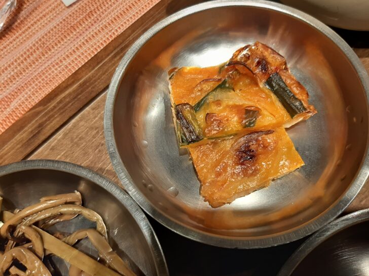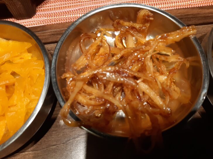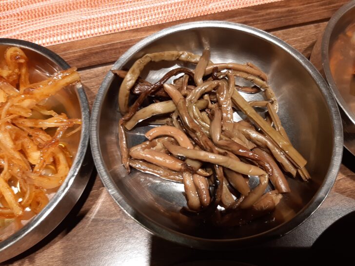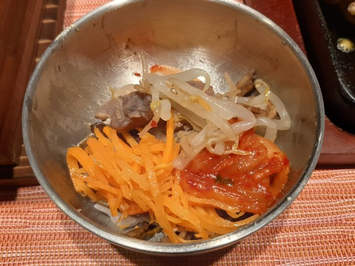 ご飯を金属の茶碗取分けて、それぞれのおかずを載せて、ビビンバ風にしていただきます。美味しいですね。