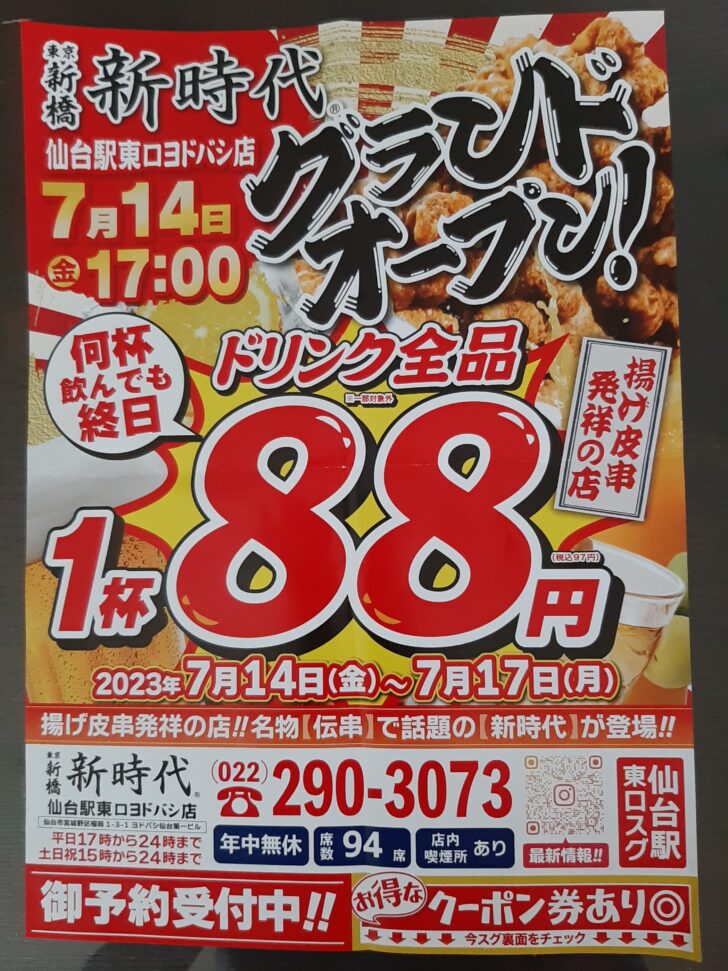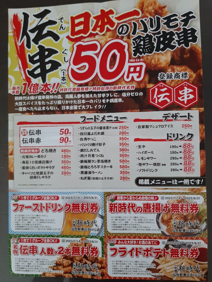 『新時代 仙台駅東口ヨドバシ店』は7/14にオープンしました。名物の鶏の揚げ皮串【伝串】発祥のお店で、1本50円(税込55円)と激安で、販売本数1億本越えの大人気となっているようです。またこのお店はドリンク類も激安で、いつでも何杯でも生ビール190円(税込209円)、ハイボール150円(税込165円)となっています。仙台では、新伝馬町店に次ぎ2店舗目となりますね。