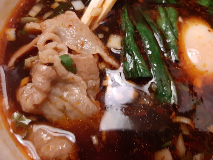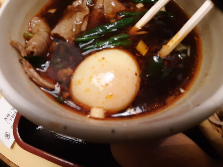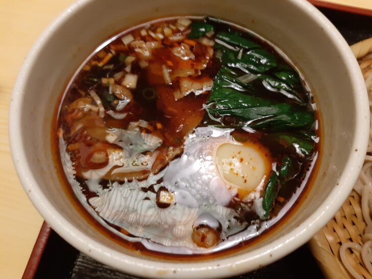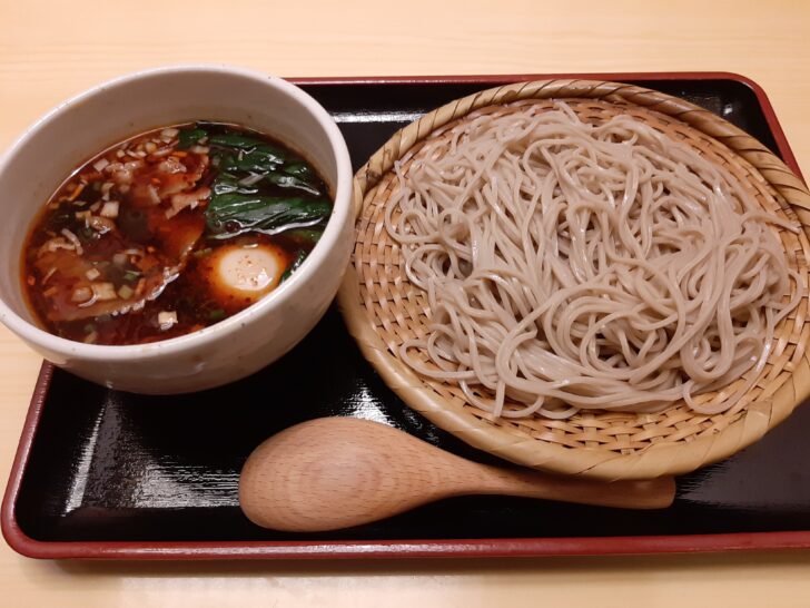 つけ汁は、通常のそばつゆにラー油、唐辛子などが入って辛さがあります。また、具材は、豚肉、味玉、ほうれん草、ねぎ等が入っていました。メニュー表の写真と比べて、豚肉が少なめでしたが、中々美味しかったです。