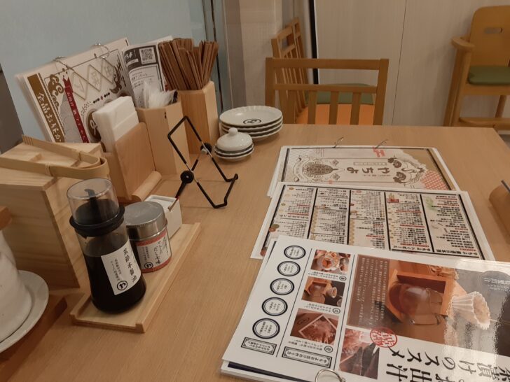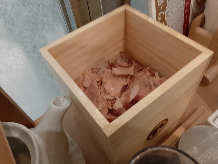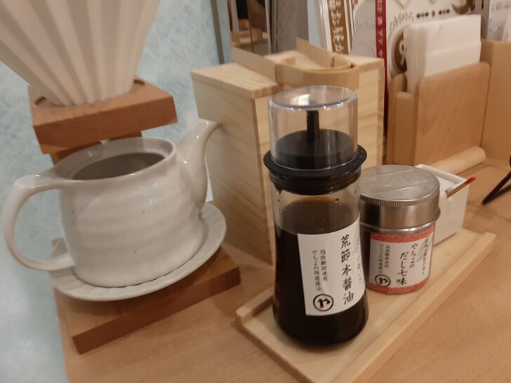 卓上調味料は、荒節本醤油、だし七味、塩、削り節ですね。