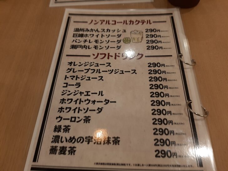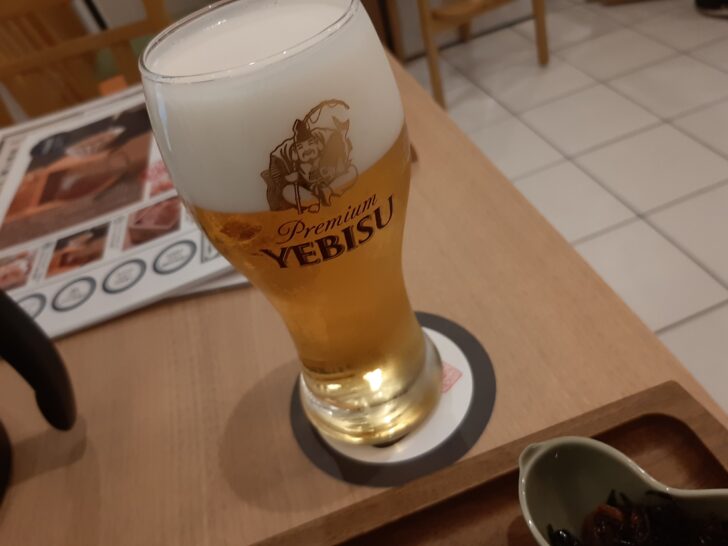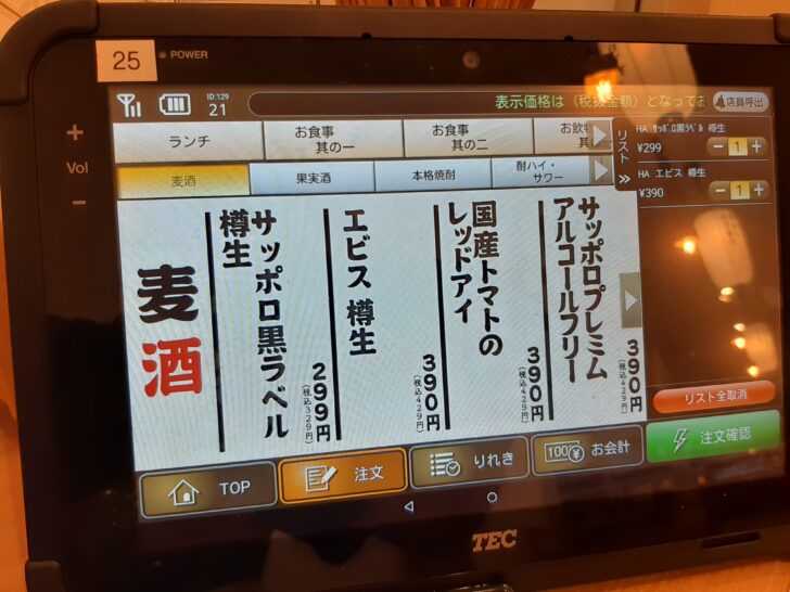 7/18(火)~7/25(火)の間は、新規開店特典として、生ビールが何杯飲んでも【税込110円/1杯】になっていますが、対象は【樽生サッポロ黒ラベル】と【エビス樽生】の2種類とのことです。タブレットでの注文では通常料金のままと表示されますが、会計時に【税込110円】に修正されます。絶対【エビス樽生】を頼んじゃいますよね。