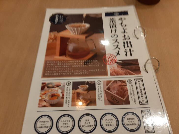 お茶漬けの作り方は、テーブルにあるやちよお出汁茶漬けの作り方を見ながら作ります。