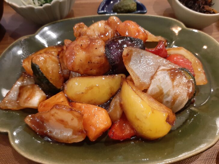 「鶏と野菜の黒酢炒め定食」は鶏唐揚げの他に、茄子、パプリカ、ズッキーニ、にんじん、玉葱と野菜がたっぷり入っていて、黒酢餡の味付けも良く美味しかったですね。