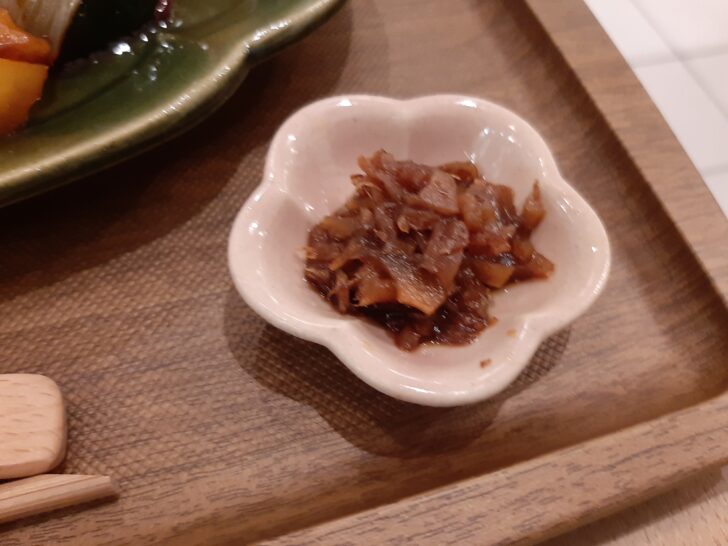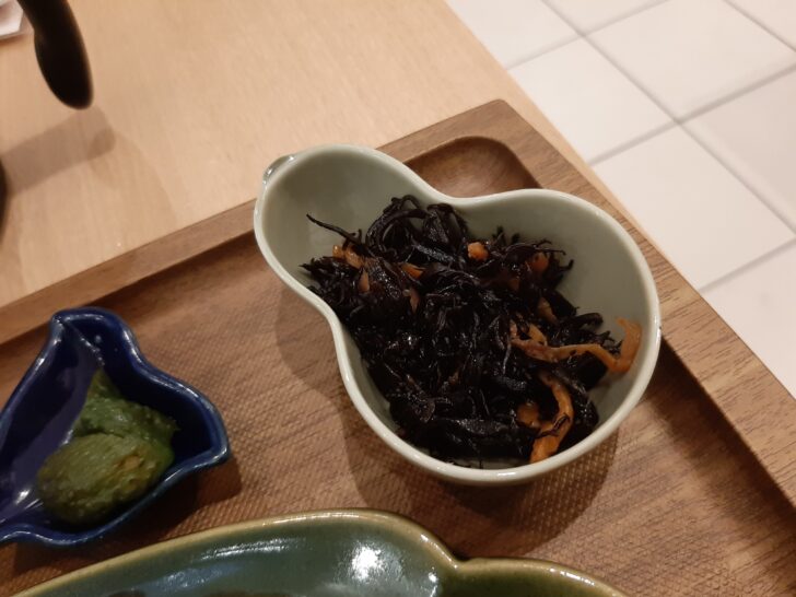 この小鉢はひじきの煮物ですね。出汁が効いた優しい味付けで美味しかったです。