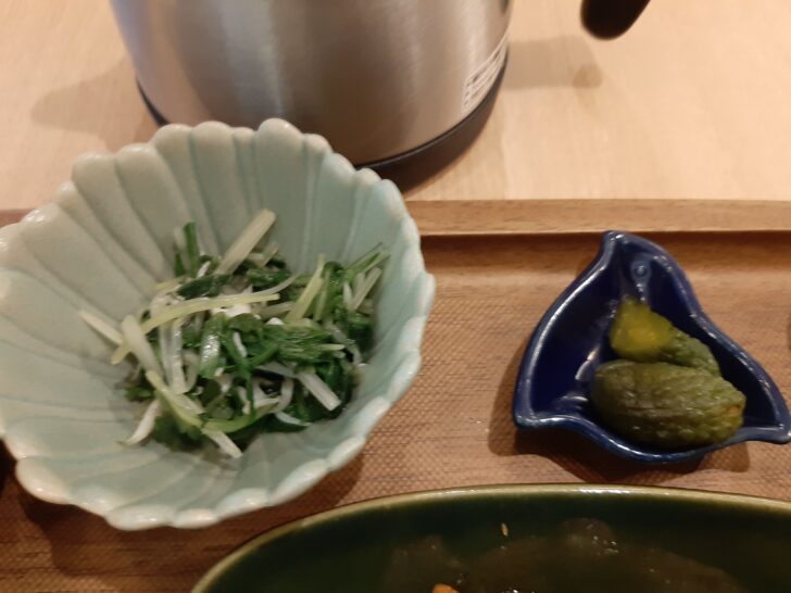 これは、左側が三つ葉としらすのお浸し、右側がちび胡瓜の漬物です。こちらも普通に美味しいです。