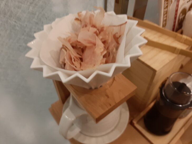 鰹節をフィルターに入れて、ポットの出汁を掛けます。