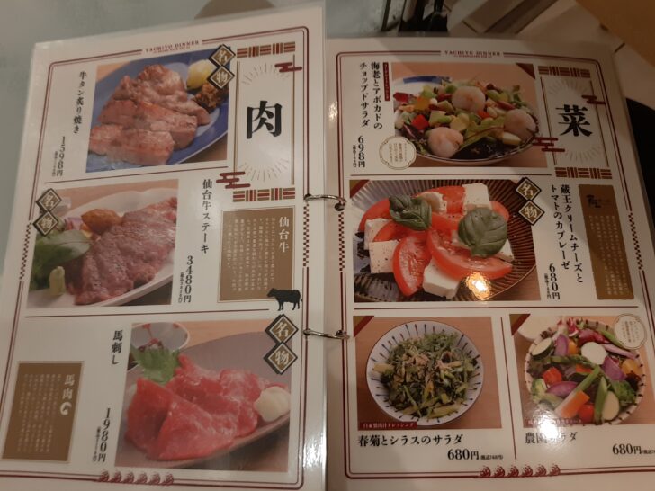 肉系は牛タン焼き、仙台牛ステーク、馬刺し、野菜系の料理もおいしそうですね。