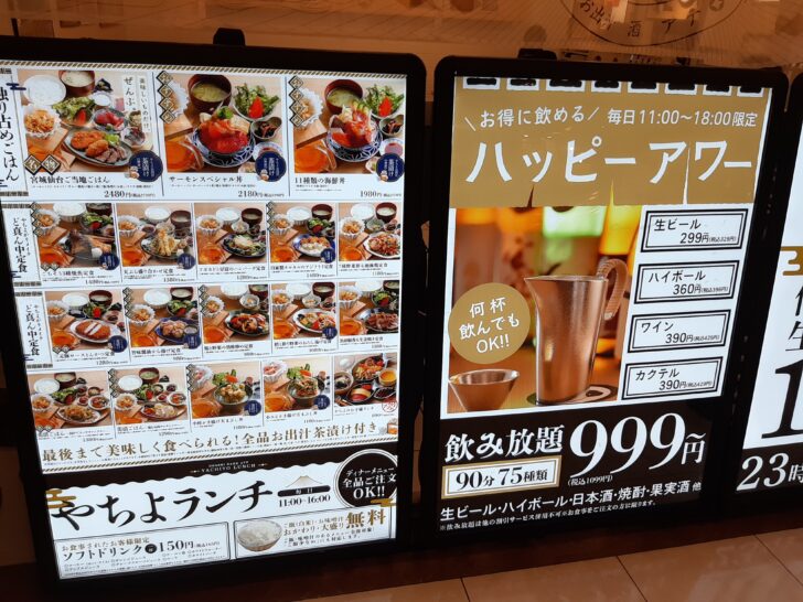 『お出汁 酒 アテ やちよ』は、仙台駅東口にもありますが、ランチはやっていないと思っていたので、行ったことはありませんでした。今回オープンした『お出汁 酒 アテ やちよ エスパル仙台店』は、ランチもメニューが豊富だし、出汁茶漬けが美味しかったので、時々は行きたいお店ですね。また、ディナータイムタイムの飲み放題も安めなので、行き易いお店だと思います。
