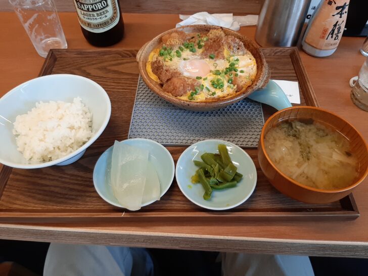 これがチキンカツ煮定食です。御飯、味噌汁、漬物、小鉢がついてきました。