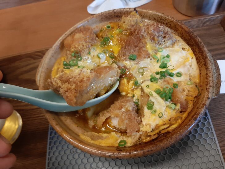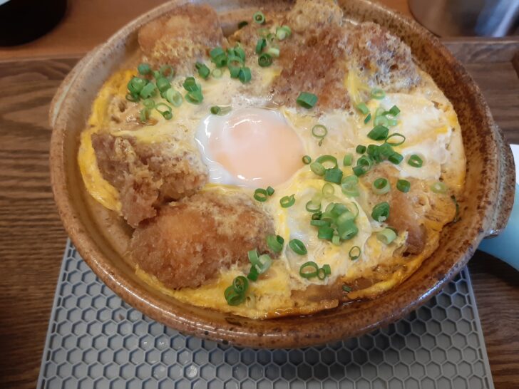 他に注文したのは、月替わり定食でした。今回の定食は「チキンかつ煮定食」でした。御飯は少な目にしてもらいました。御飯は大盛りも特盛も無料のようです。