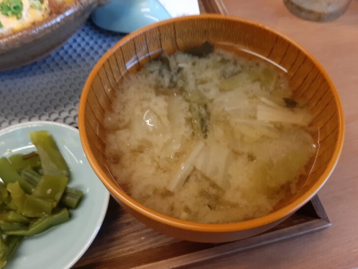 定食の味噌汁は、キャベツなどの野菜たっぷりの具材が入っていました。