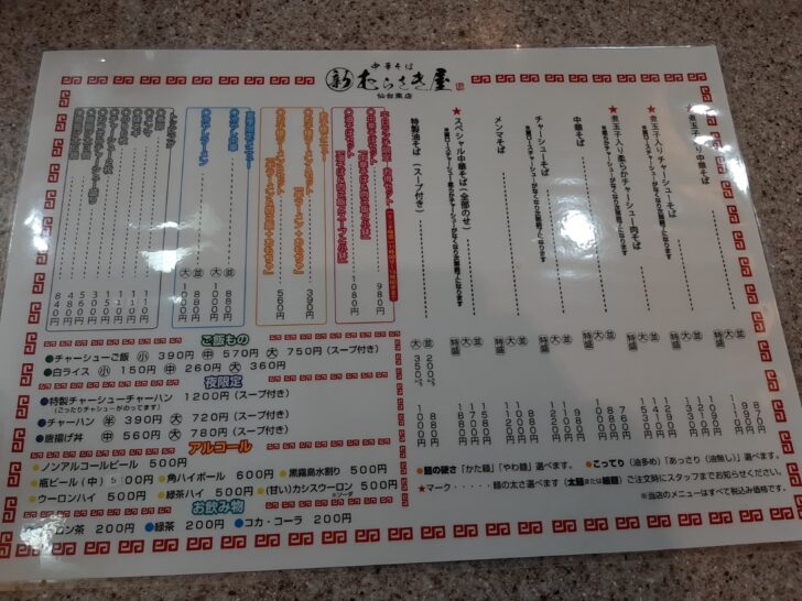 中華そば『新むらさき屋 仙台東店』のメニュー