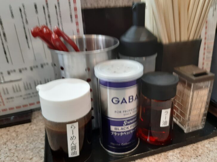 卓上調味料は、らーめん醤油、ブラックペッパー、ラー油、酢ですね。