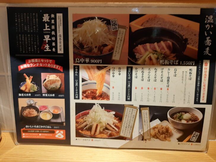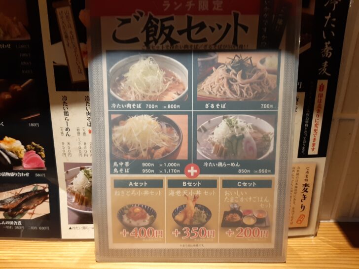 ランチタイム限定で「冷たい肉そば」と「ざるそば」が通常価格【税込750円】⇒【税込700円】と割引になります。また、セットメニューの御飯ものも割引になるので、お得ですね。