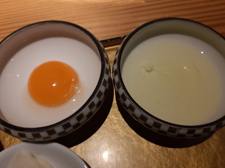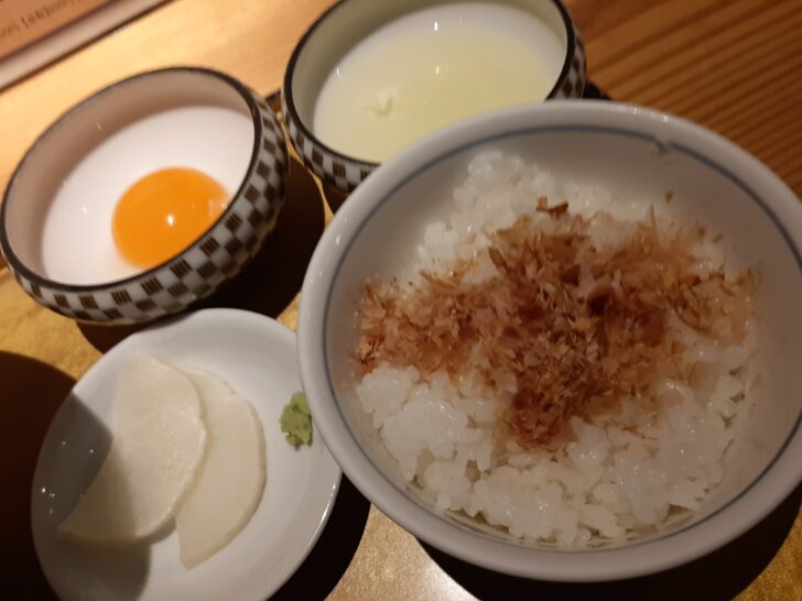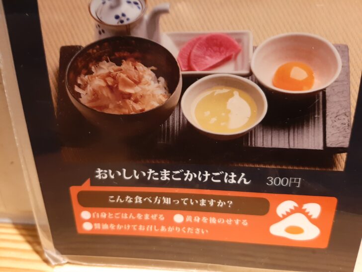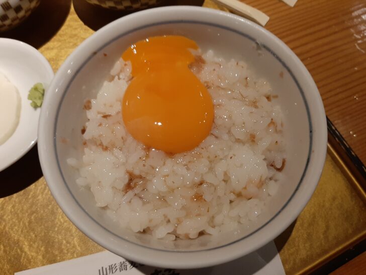こんなTKG(たまごかけごはん)は、初めて食べました。卵は白石市の「竹鶏ファーム」のものなので、美味しいですね。御飯には、かつお節が載っています。