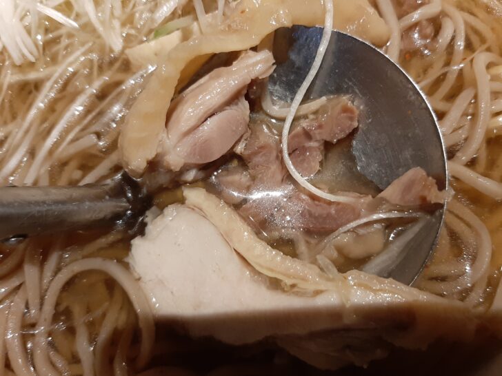 鶏肉の量は、それほど多くはないですが、親鳥と若鳥の両方が入っています。親鳥肉はコリコリの食感と旨味が良いです。若鳥肉は柔らかくて美味しいですね。