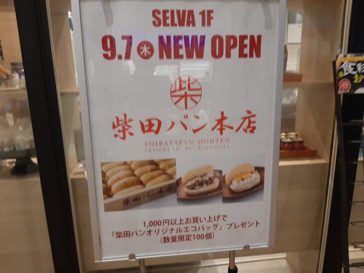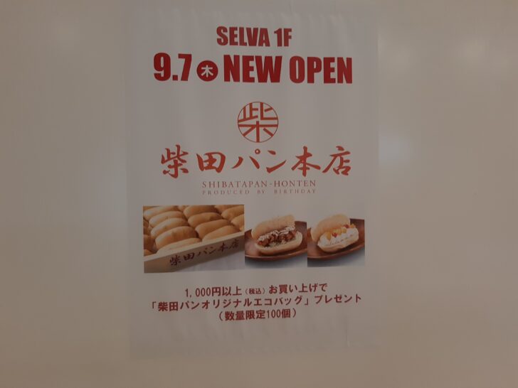 『柴田パン本店』セルバ店のオープン記念特典は、1,000円以上お買い上げで「柴田パンオリジナルエコバック」をプレゼントして貰えるようです。但し、100個の数量限定のようです。