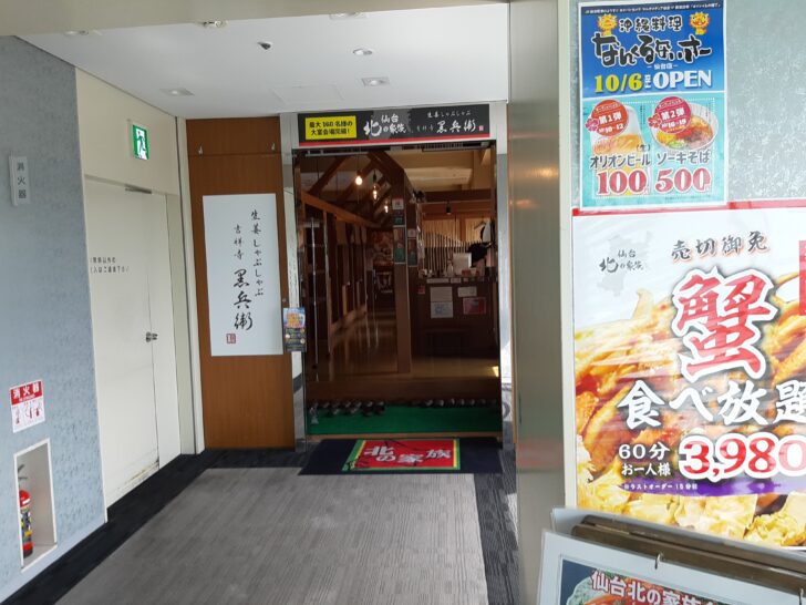 なんと沖縄料理『なんくるないさー仙台店』のオープン日とオープン記念セールのポスターは、『オイシイもの横丁』には掲示されていません。なんと仙台タワービル21階の「北の家族/生姜しゃぶしゃぶ黒兵衛」の入口に掲示されていました。北の家族も運営会社が同じなので分かりますが、何故ここだけに掲示されているのでしょうかね?