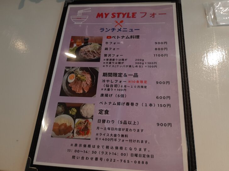 ベトナム料理『MY STYLE フォー』のメニューは次の通りです。