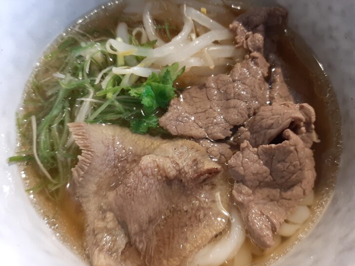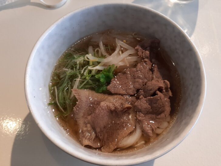 「フォー」を食べてみたかったのですが、日替わり定食も気になっていました。それで、日替わり定食+半フォーを注文しましたが、かなりのボリュームがありました。まずは、半フォーをいただきました。具材は、牛肉、牛タン先、もやし、ネギ、パクチーですね。注文時にパクチーは大丈夫ですか?と聞かれました。