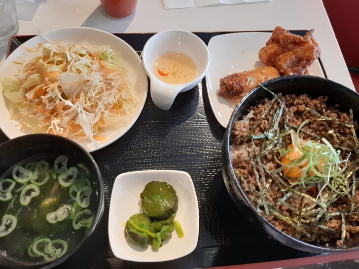 本日の定食は、そぼろ丼、鶏唐揚げ1個、揚げ春巻き1本、野菜サラダ、キュウリの漬物、ワカメスープです。