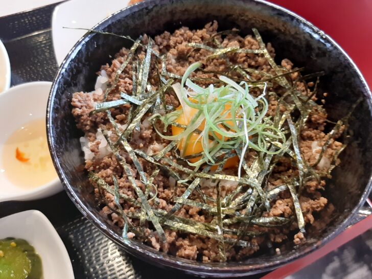 そぼろ丼のひき肉は、仙台牛の肉とのことです。卵黄、海苔、ねぎも載っていて美味しかったです。普通盛ですが、結構ボリュームありました。