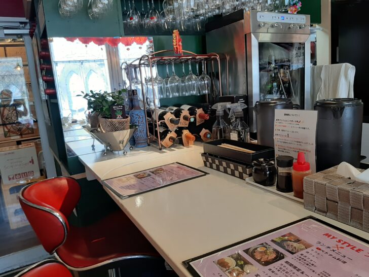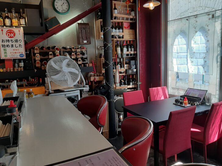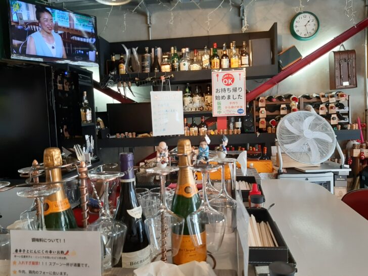 お店の中は元々ワインバー「オガーレ」なので、ワインやワイングラス等がたくさん並んでいます。お店は、カウンター6席と4人掛けテーブル2卓のこじんまりとした造りになっています。