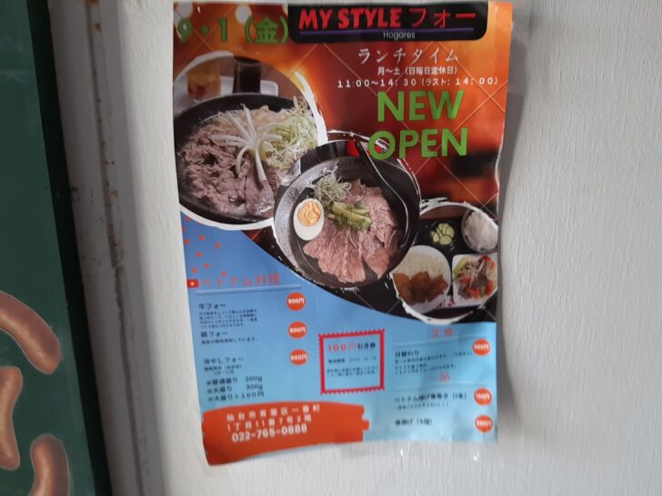 ベトナム料理『MY STYLE フォー』が、仙台市青葉区一番町1丁目のワインバー「オガーレ」の間借飲食店として、ランチタイムのみの営業で2023年9月1日オープンしました。早速行ってみたので紹介します。