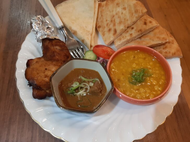 「カレーセットC」は、カレー2種類(マトンカレー、チャナダルカレー)とタンドリーチキン、ピタパン、トルティーヤ、サラダがセットになっています。カレーの辛さを選択するのを忘れたので、どの辛さで提供されたのか分かりませんが、そんなに辛くありません。