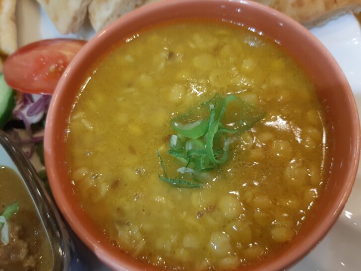 チャナダルカレーの豆は本当はひよこ豆のはずですが、黄色えんどう豆のようです。これがたっぷり入っていましたが、カレー?と思えない程あっさりした味付けで、辛さもあまり感じられなかったです。