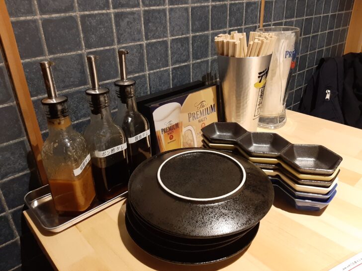 卓上調味料は、餃子の「醤油タレ」「ポン酢タレ」「味噌タレ」の3種類が置いてありました。また、取り皿、割り箸、紙ナプキンの他に餃子のタレ用の3連皿も置いてあったので、手軽に3種類のタレで食べれるので嬉しいですね。