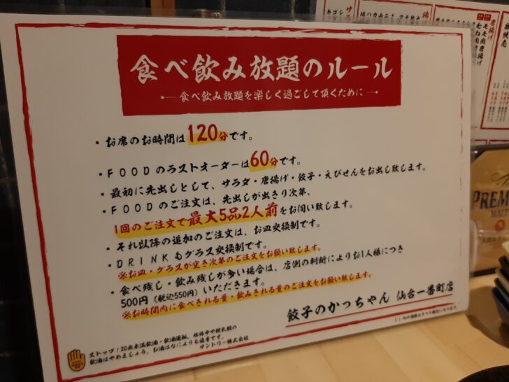『餃子のかっちゃん 仙台一番町店』では、「食べ飲み放題コース」にした場合、「食べ飲み放題のルール」というのがあって、スタート前にお店の方の説明がありました。このルールについてまとめてみました。