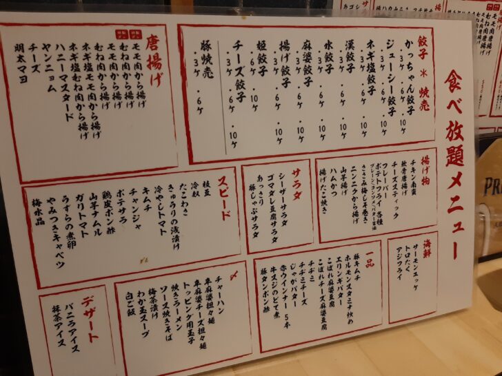『餃子のかっちゃん 仙台一番町店』の「食べ放題メニュー」がこちらですね。通常料理メニューとはまったく同じではなく、若干メニューが絞られているようです。