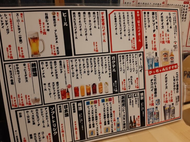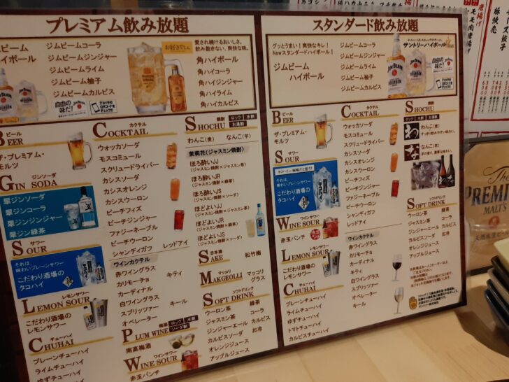 飲み放題のメニューには、スタンダード飲み放題とプレミアム飲み放題の2種類あります。大きな違いは、プレミアム飲み放題には、角ハイボール、翠ジンソーダ、ジャスミン焼酎、日本酒、梅酒、マッコリ等が含まれるようです。